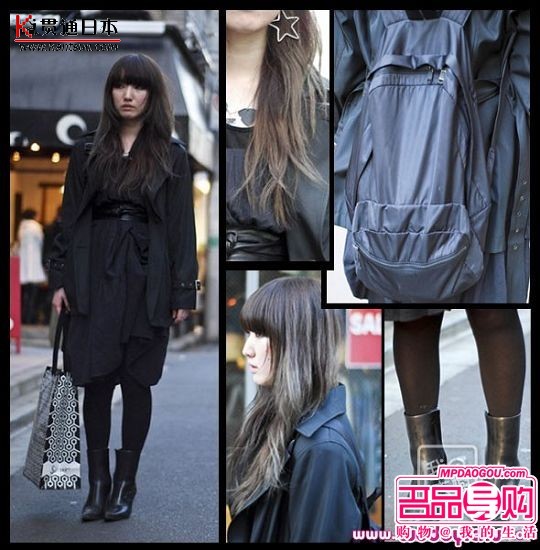 从正面看,十分OL的打扮,黑色的外套,黑色的连衣裙和黑色的简洁款短靴,难道领个购物袋就出门了?其实不然,看背后恍然大悟,黑色双肩包来助阵。 |