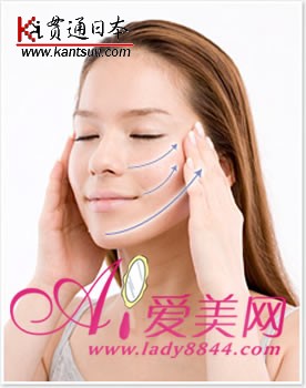 脸部提拉按摩 完成头皮按摩之后,将手洗净,挤压出适量的乳液,均匀涂抹在脸上。然后按照图示的方法,由里至外的向上提拉按摩脸颊。