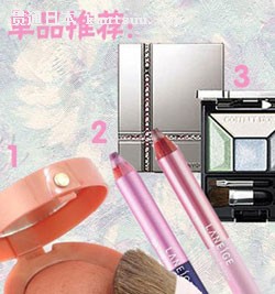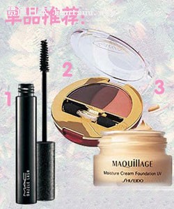 1、M.A.C魅可魔幻夺目睫毛膏 ¥130.00 2、娇韵诗焕彩单色眼影粉 ¥240.00 3、兰芝魅彩双色眼影笔 ¥165.00 三、粉紫色甜美浪漫