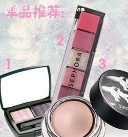 1、香奈儿超炫耀双色眼影 ¥460.00 2、丝芙兰sephora炫闪6色唇彩 ¥129.00 3、贝玲妃无皱两用眼影眼线膏 ¥220.00 |