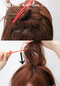 将顶部留出的头发用发夹夹在马尾辫的发根部,然后按图片所示往上拉头发使之显得蓬松些。如果怎么弄头发都蓬松不起来的话可以事先用梳子逆梳1-2次头发。