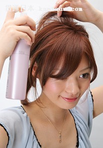 喷上啫喱水以保持顶部的蓬松状态,注意要从头发的内侧喷进去而不是喷在表面上。
