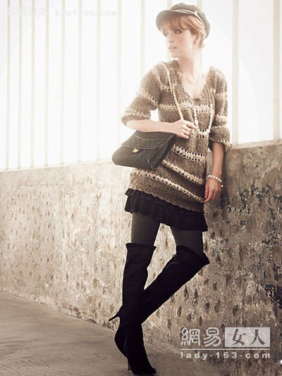 长靴配legging,温暖又保险。灰色的针织YY上有镂空的白色针织拼接,袖口、领口和衣角都有编有小花边显得十分精致。十足甜美扮相! |
