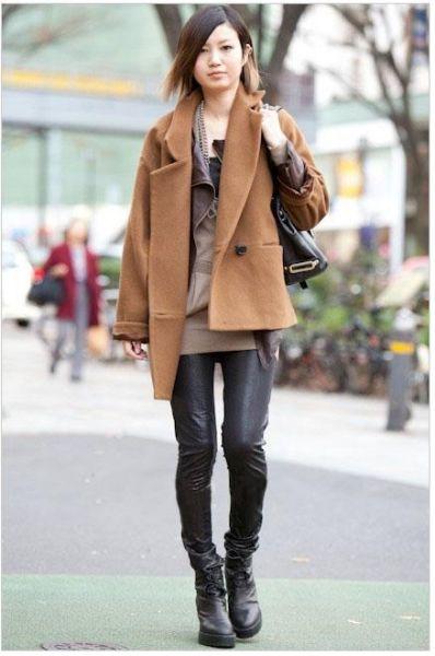 棕色宽版外套轻松穿出帅气中性风格,mix连体皮裤前卫却不强势,露出颈部的做法性感有道。 |