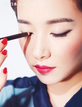 1、上眼线画宽: 贴好假睫毛后,用眼线笔沿着上睫毛根部,将睫毛根部间的空隙填满。然后从眼头到眼尾画出一条较粗的眼线。眼线的宽度以睁开眼后,与上眼皮褶皱重合为准。