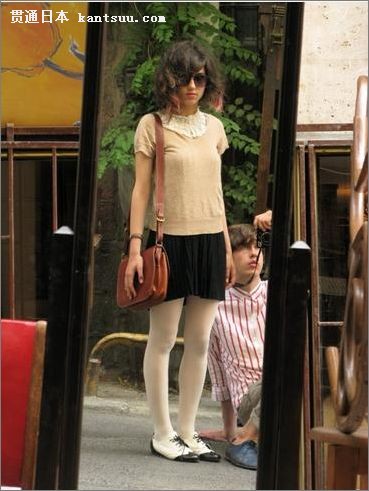 蕾丝领杏色上衣是女生必备单品,08F/W几大秀场都大刮维多利亚风,宫廷蕾丝成为时尚焦点。黑色百褶短裙很有复古味道。鞋子与整体协调的很好。包包绝对是拯救整体造型的绝佳单品。再注意一下为她拍照的男生,brit-pop发型和竖条衬衣,很有型。 |