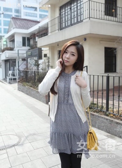 很多MM都会选择在春天穿碎花连衣裙,在连衣裙外套上一件这样的短款针织外套就更甜美啦! |
