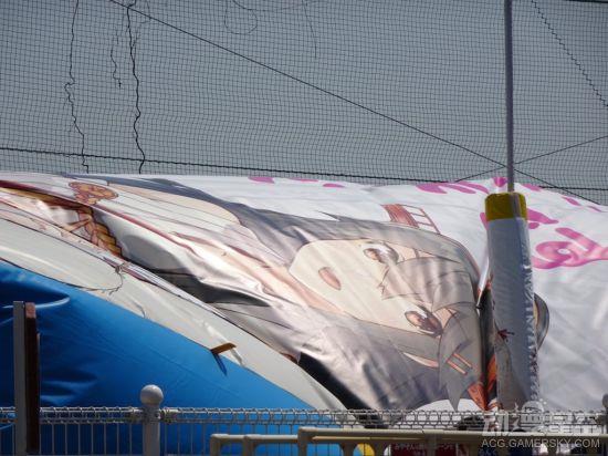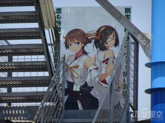 在前往蹦极站台的楼梯上,可以看到比叡、雾岛等角色的超大宣传海报,而蹦极固定游客用的绳头那端则贴了金刚的立绘,下面重的充气垫则是榛名的超大海报。玩家可以抱着金刚跳进榛名的怀抱。