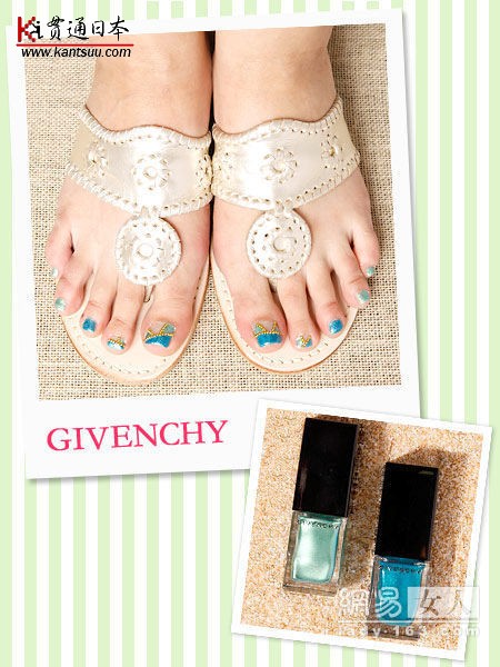 5. 渐变蓝色 艺术感 这款纪梵希”甲油的设计理念来自民族色彩的灵感。两种颜色的交融属于同一色相间明度过渡,这种视觉上最舒适的色彩呈现出一种清新而自然的夏日风情。金色甲油的点缀就像海水拍打石头激起的层层波浪,给人不断的冥想,同样适合搭配浅色的简约凉鞋。 纪梵希 指甲油限定发售¥2,625日元