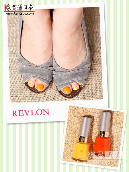 6. 黄色+橙色 水果味 水果色指甲油随时玩转春天色彩,鲜艳多汁的橘色和黄色看起来非常可爱,犹如彩色的霓虹灯,在艳阳高照下,可爱的脚指甲变得显得绚烂夺目,运用鲜艳的水果色,使造型清纯、甜美,适合搭配暖色调麂皮凉鞋。 REVLON 指甲油¥735日元
